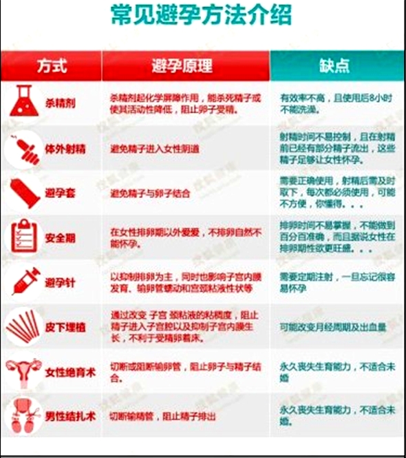 避孕的方式有很多,常見的主要有工具避孕、藥物避孕和自然避孕。工具避孕有很多種(zhǒng)方式,主要運用安全套來達到避孕效果。 藥物避孕包括長(cháng)效、短效和緊急避孕藥等,一般對(duì)女性生理健康有影響,不提倡用。