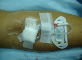 3、拔管後(hòu)按壓穿刺點5~10分鍾,無菌紗布覆蓋穿刺點,膠布固定24小時(shí)。囑患者拔管後(hòu)24小時(shí)内減少穿刺肢體活動,以防出血。