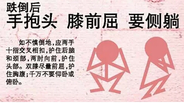 若被(bèi)推倒,要設法靠近牆壁,身體蜷成(chéng)球狀,雙手在頸後(hòu)緊扣保護最脆弱的部位