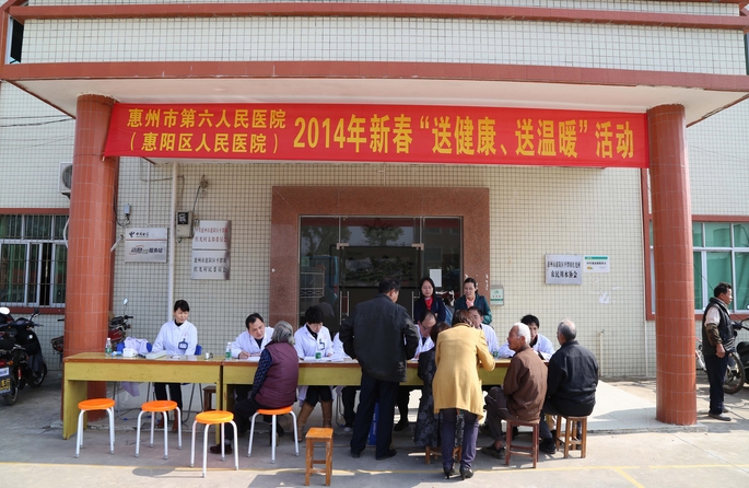 圖爲惠陽區人民醫院醫療隊爲扶貧開(kāi)發(fā)挂鈎紅光村村民進(jìn)行義診活動現場