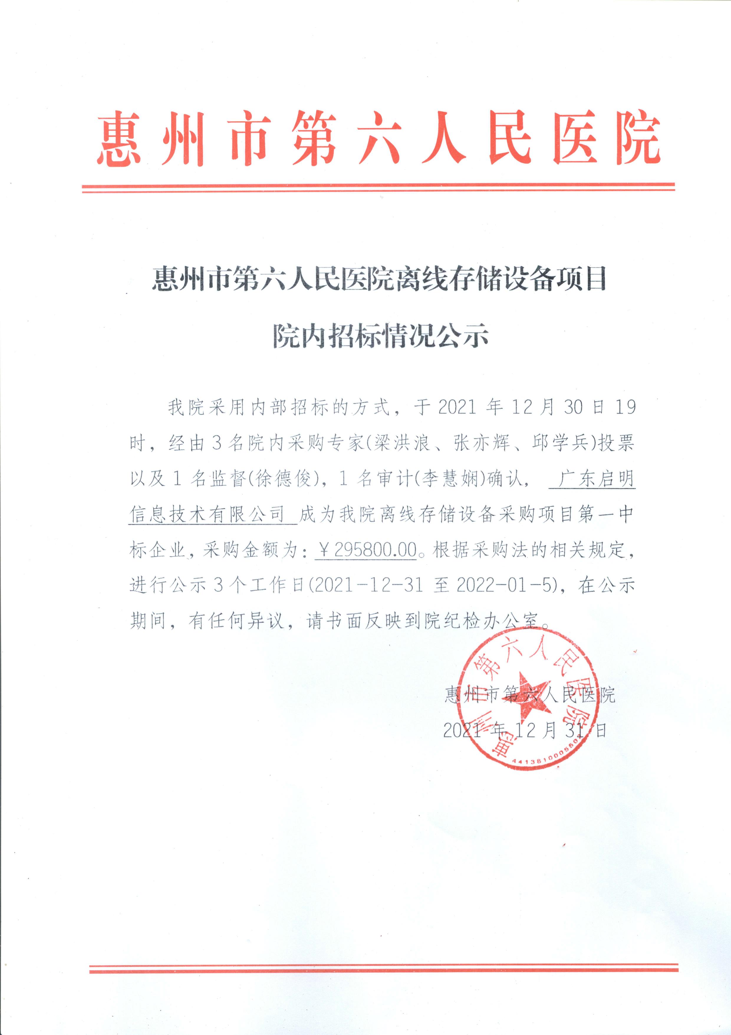 惠州市第六人民醫院離線存儲設備項目院内招标情況公示