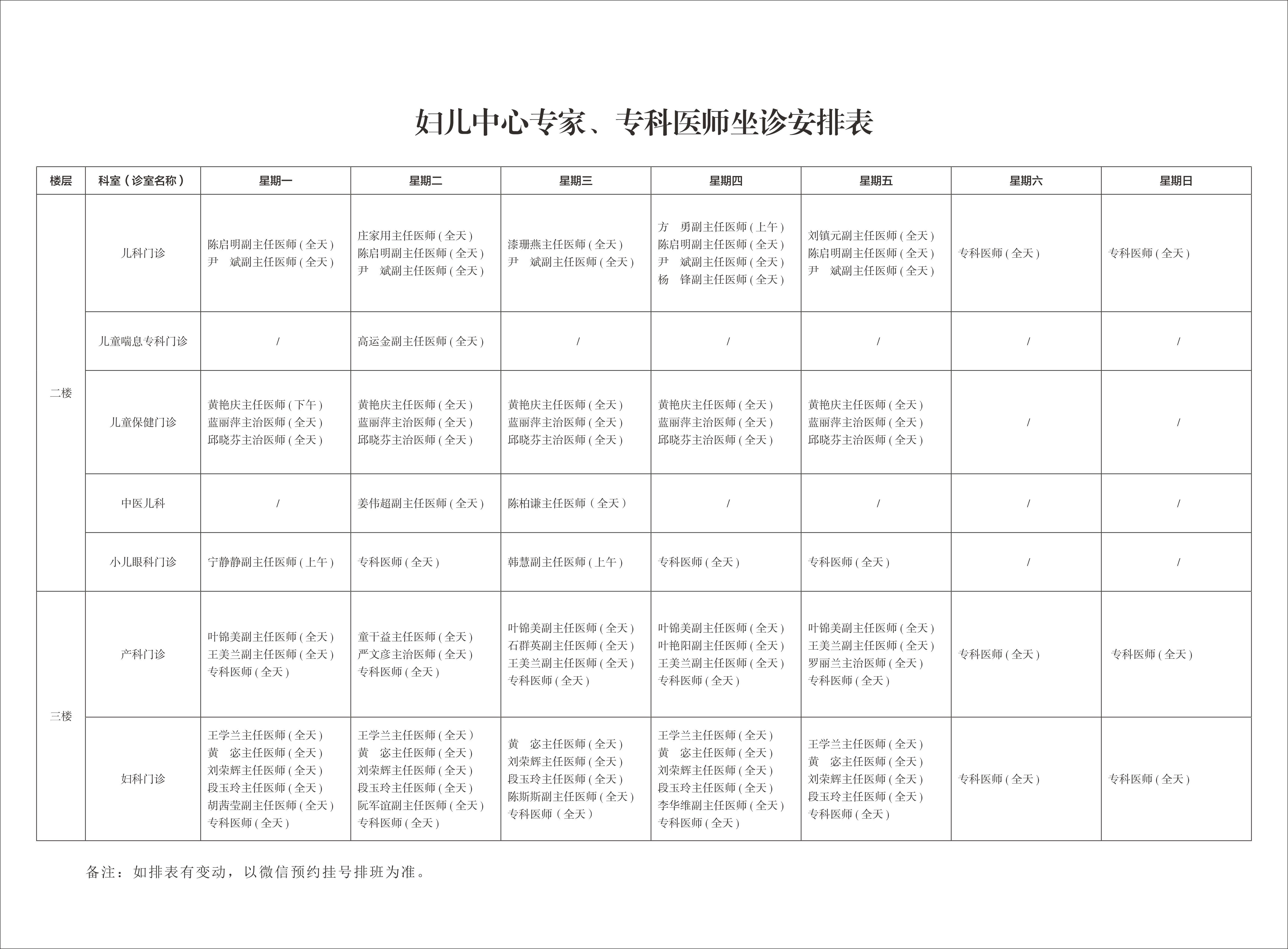 婦兒中心專家、專科醫師坐診安排表