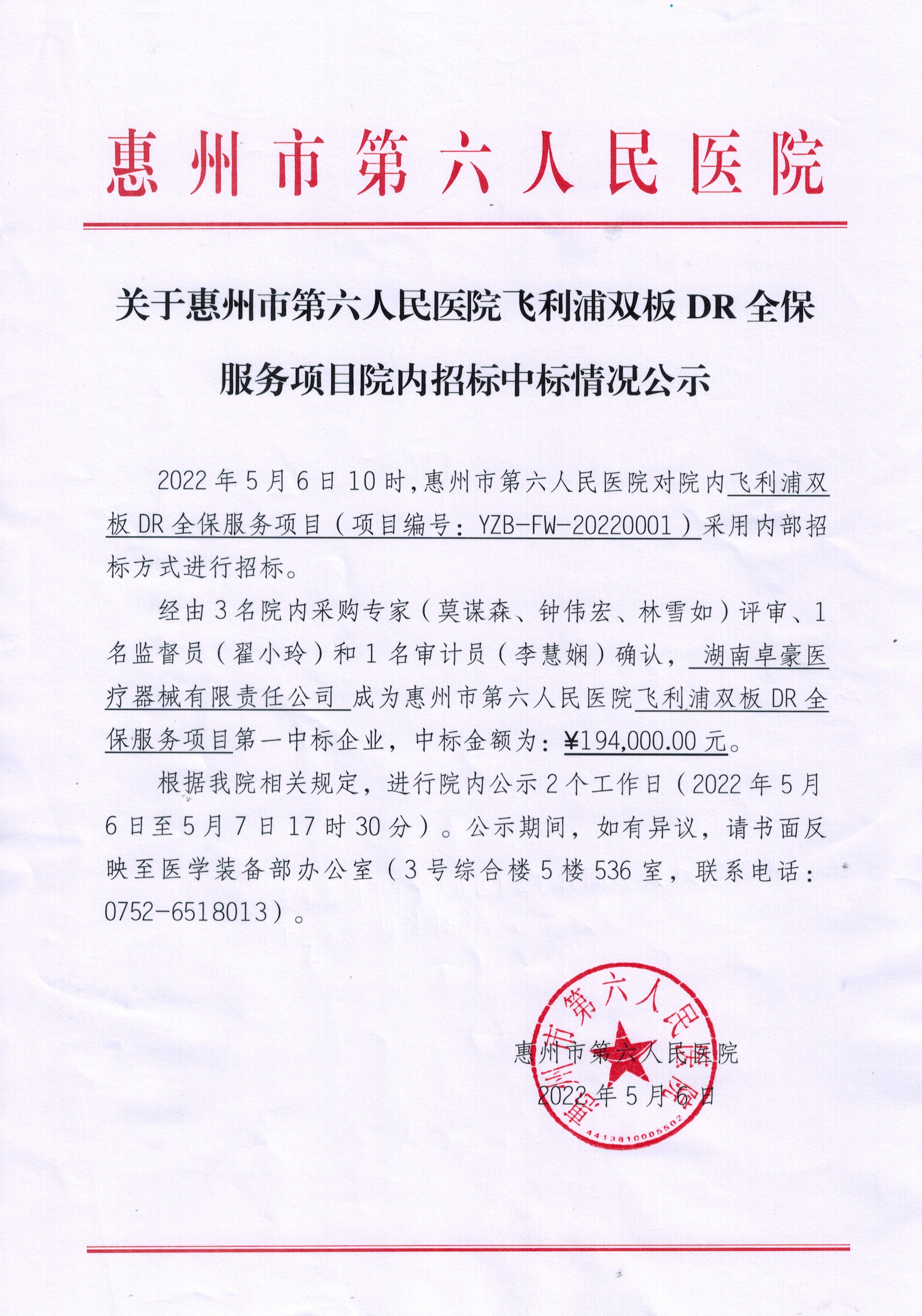 關于惠州市第六人民醫院飛利浦雙闆DR全保服務項目院内招标中标情況公示