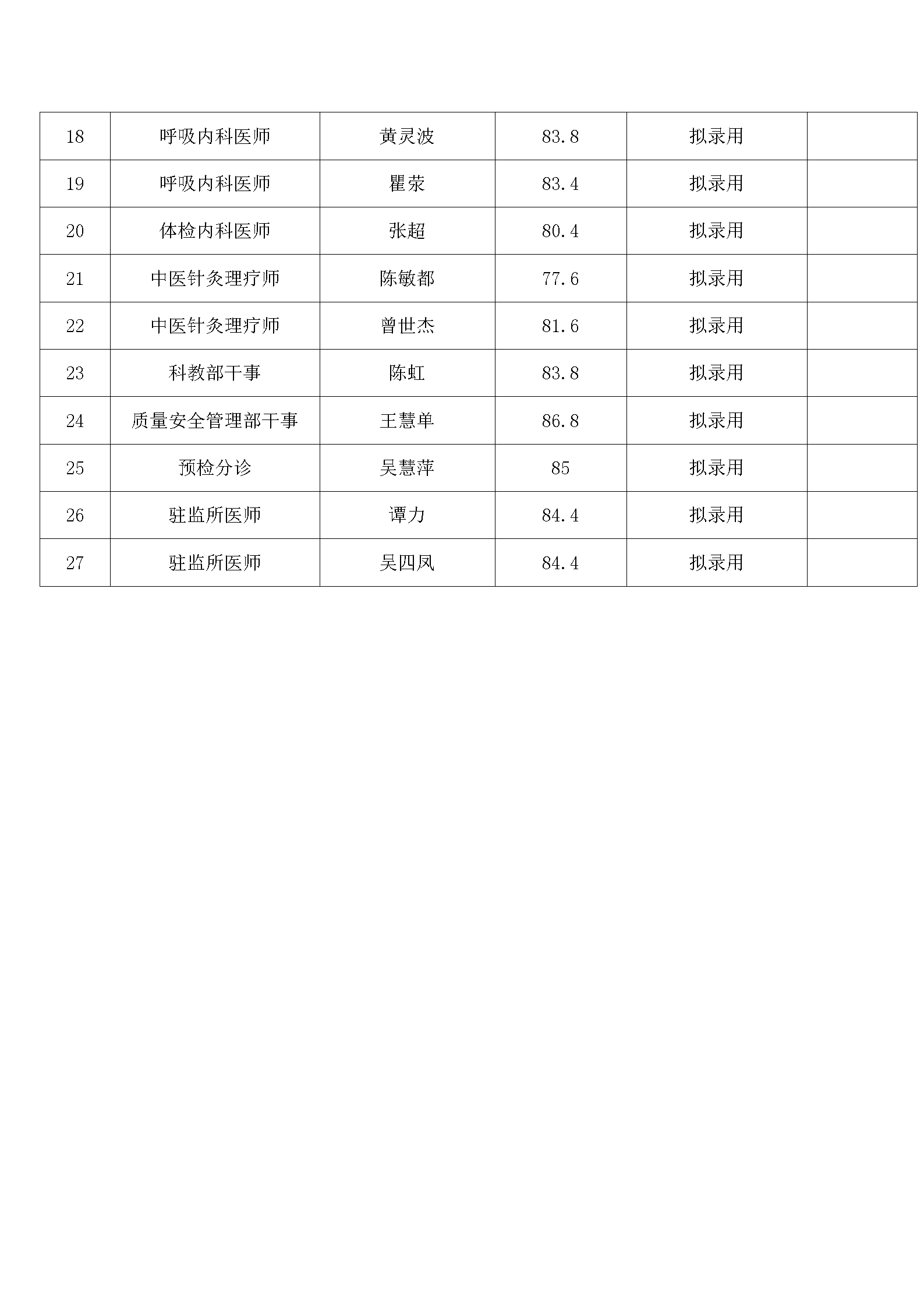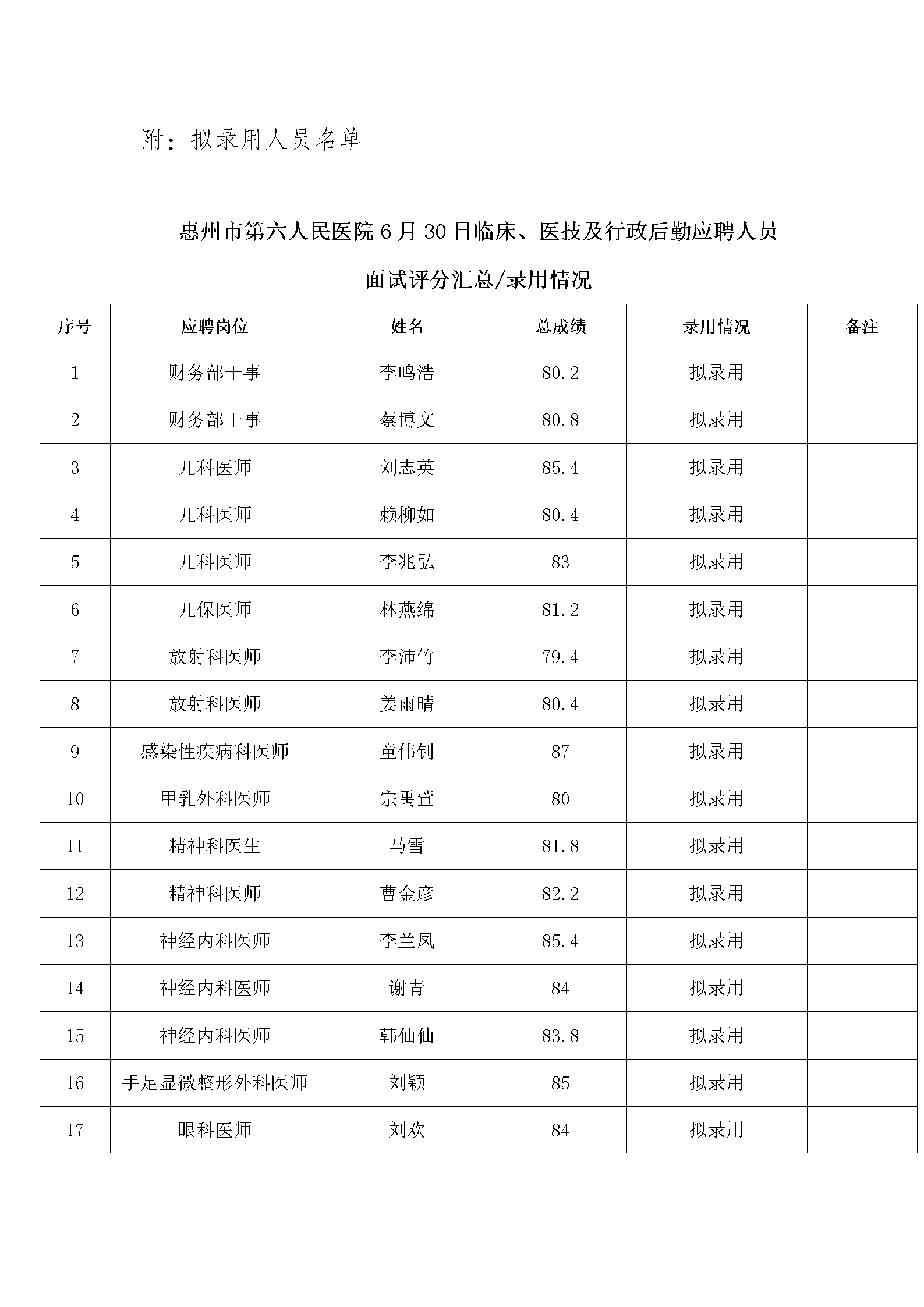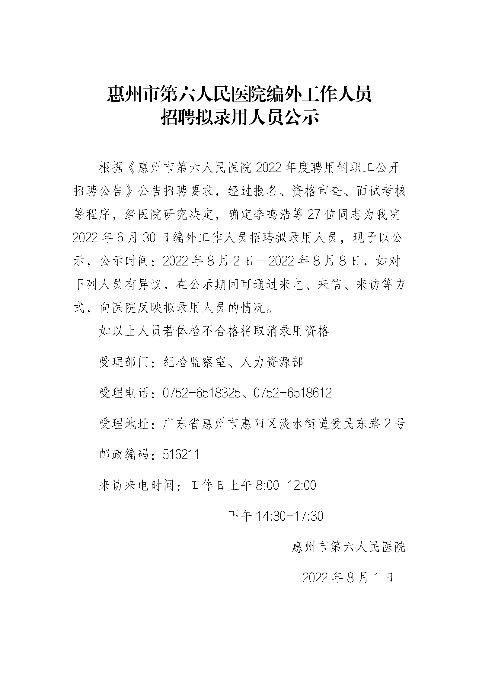 惠州市第六人民醫院編外工作人員招聘拟錄用人員公示
