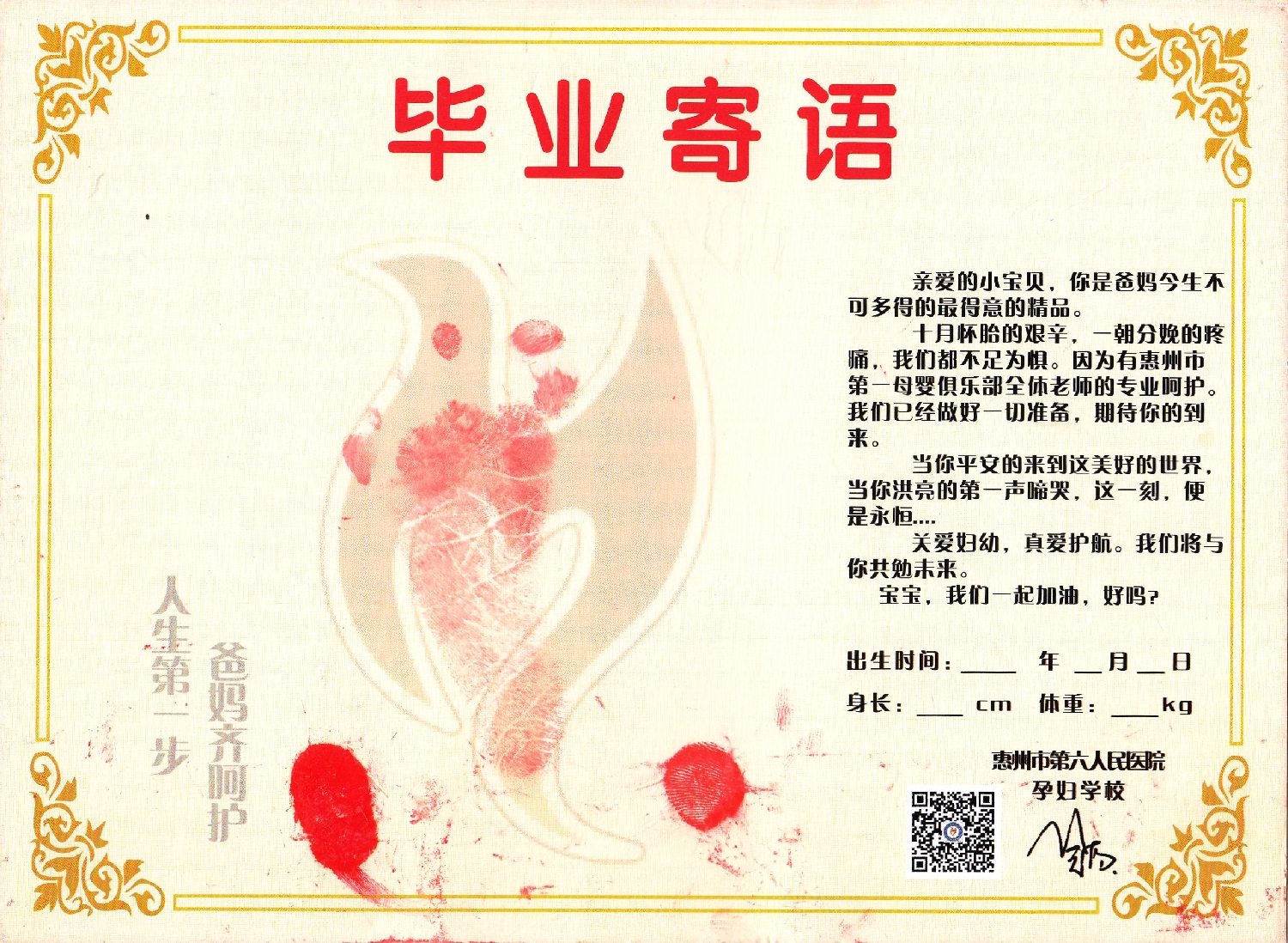 今年3月份,孕婦學(xué)校還(hái)特設置了孕婦學(xué)校畢業卡片,爲了鼓勵積極好(hǎo)學(xué)的新手媽媽,在孕期聽滿4次課以上,給予頒發(fā)孕婦學(xué)校畢業證,媽媽們分娩時(shí),蓋上寶寶可愛的小腳印。讓這(zhè)張承載了孕婦學(xué)校老師們滿滿地祝願的畢業證,從寶寶出生那一刻起(qǐ),就(jiù)烙上與媽媽共同成(chéng)長(cháng)的印記,爲寶寶今後(hòu)精彩人生留下美好(hǎo)的回憶。