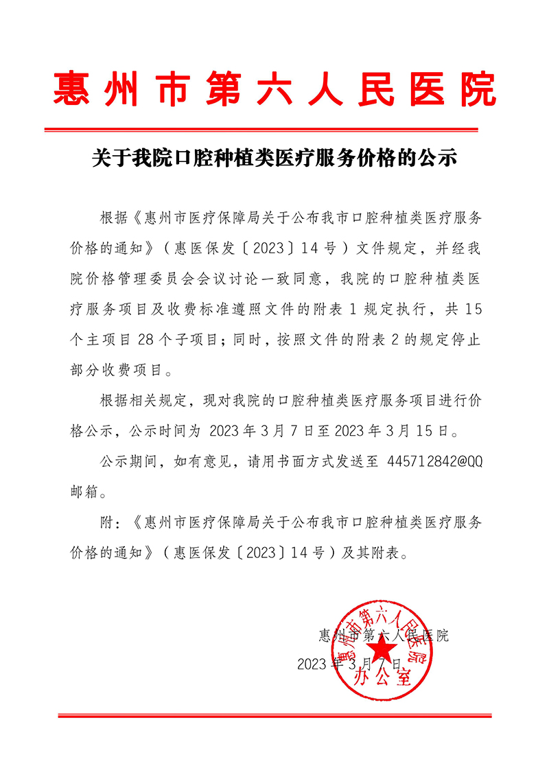 惠醫保發(fā)〔2023〕14号惠州市醫療保障局關于公布我市口腔種(zhǒng)植類醫療服務價格的通知