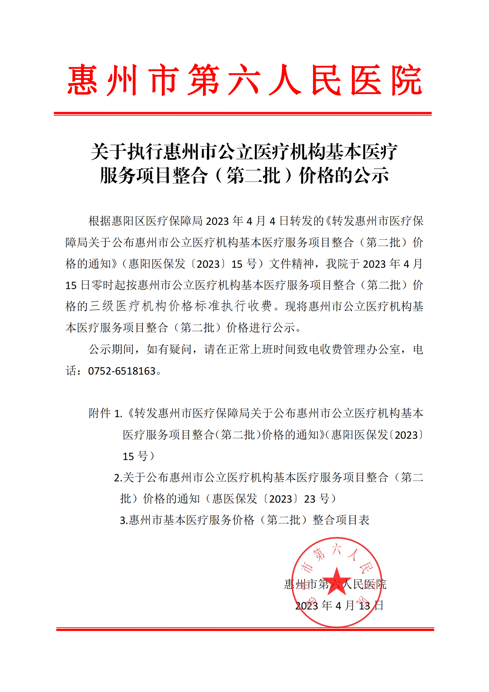 附件一:《轉發(fā)惠州市醫療保障局關于公布惠州市公立醫療機構基本醫療服務項目整合(第二批)價格的通知》(惠陽醫保發(fā)〔2023〕15 号)