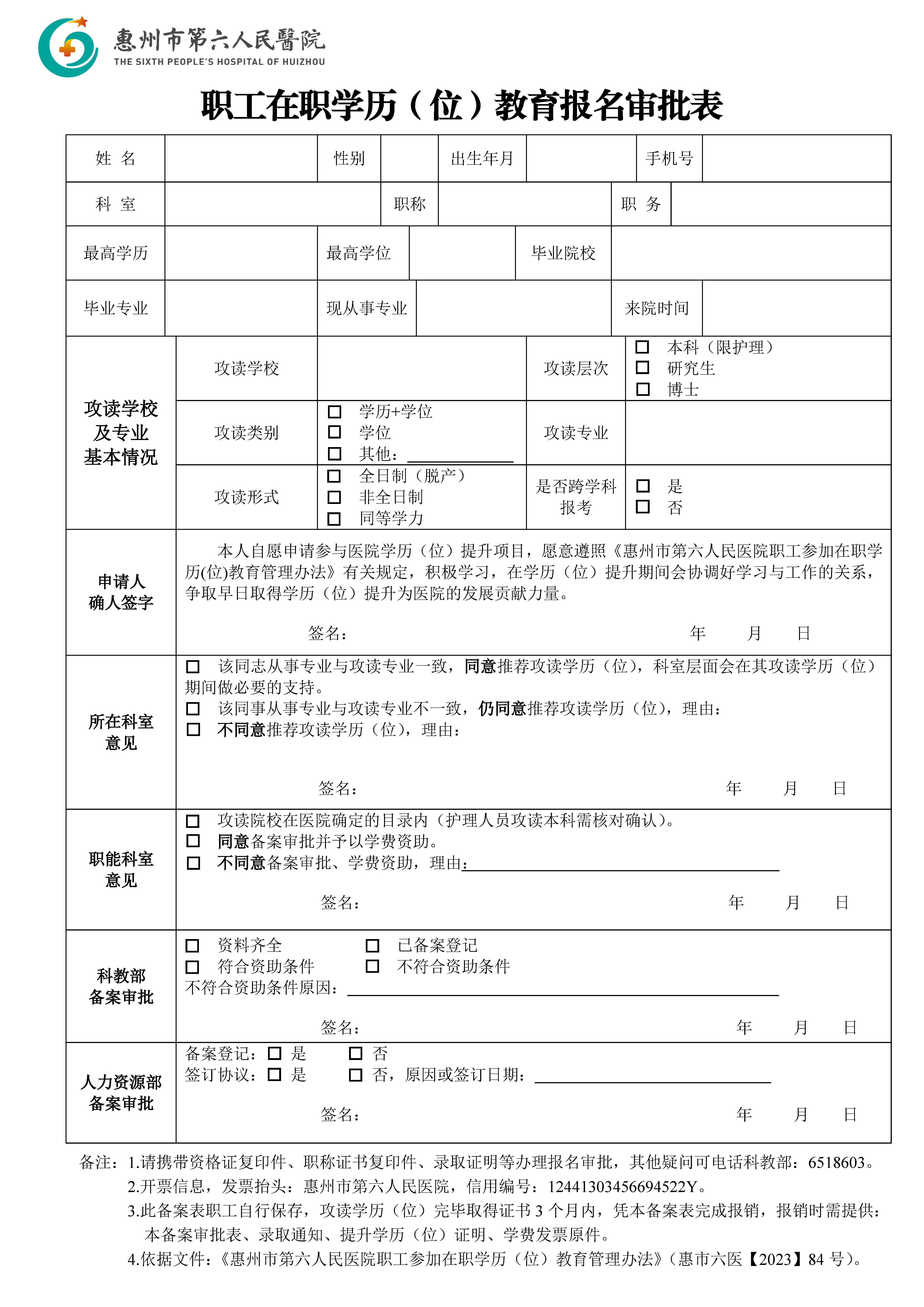 點擊下載:惠州市第六人民醫院職工在職學(xué)曆(位)教育報名審批表