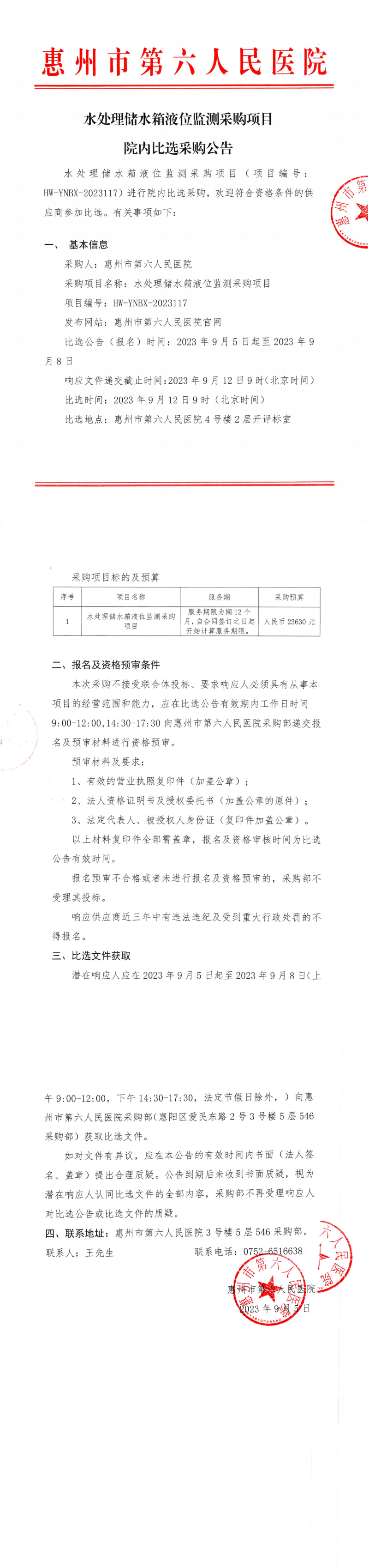 水處理儲水箱液位檢測采購項目院内比選采購公告