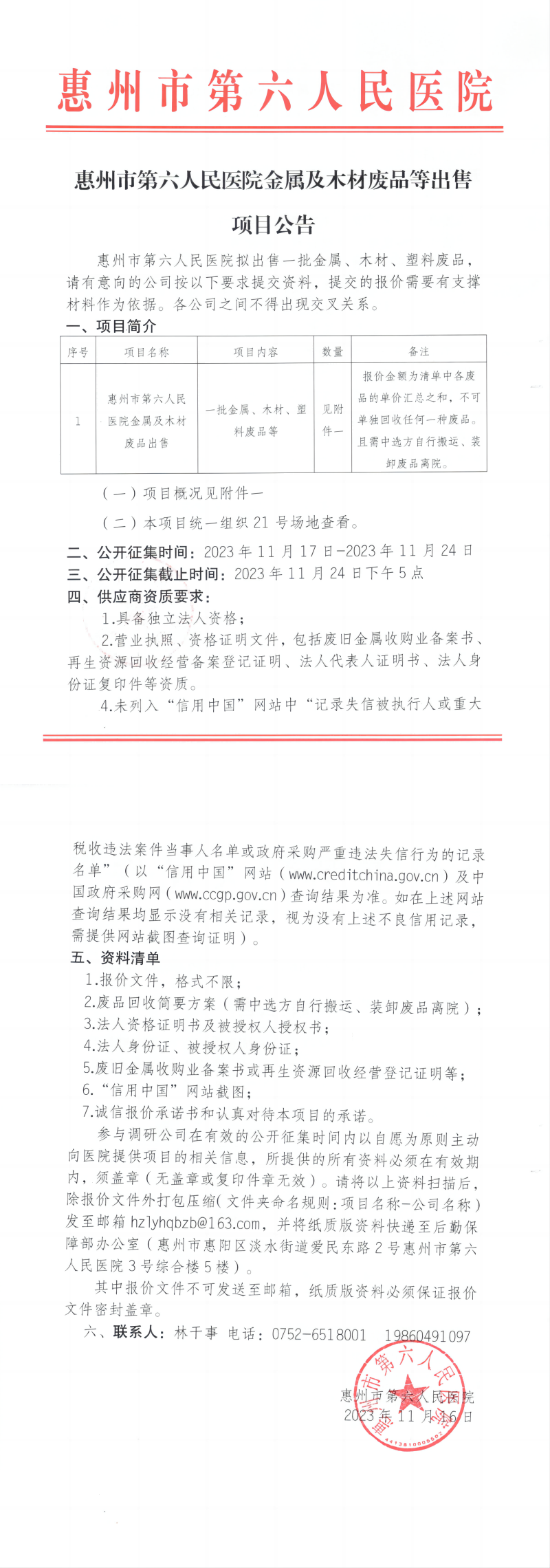惠州市第六人民醫院金屬及木材廢品等出售項目公告