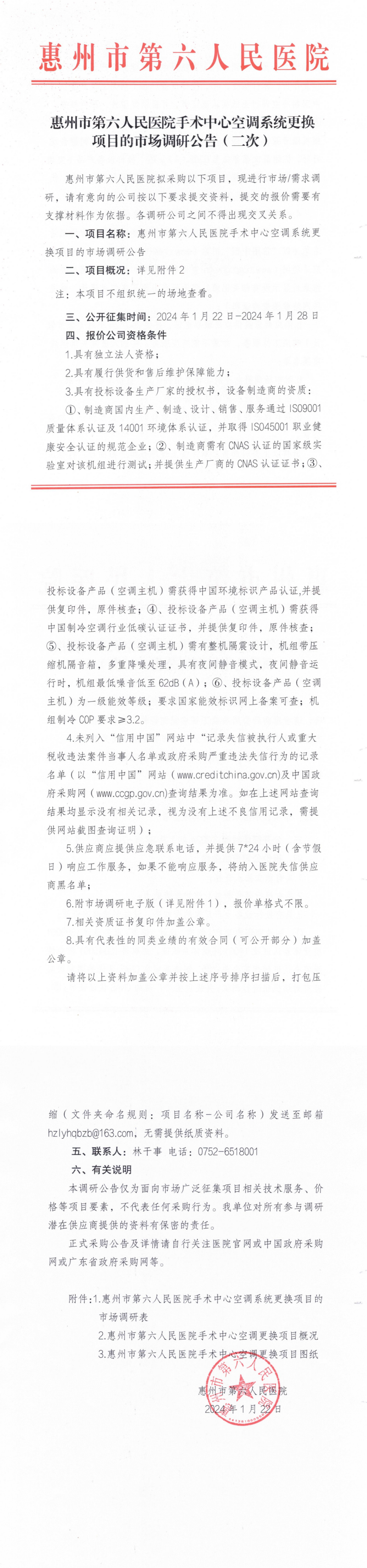惠州市第六人民醫院手術中心空調系統更換項目的市場調研公告(二次)