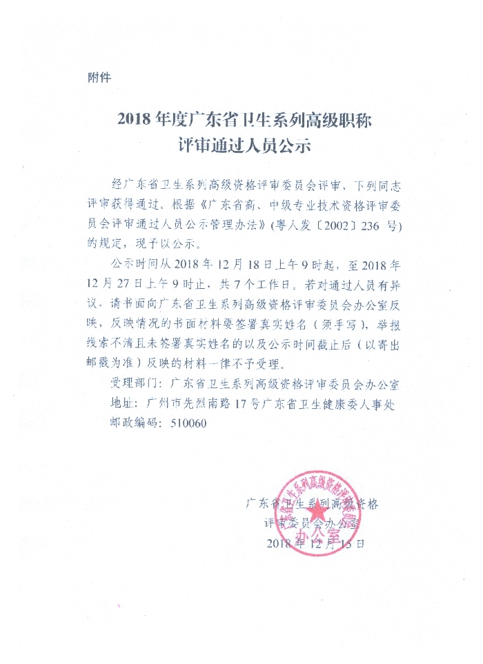 2018年度廣東省衛生系列高級職稱評審通過(guò)人員公示