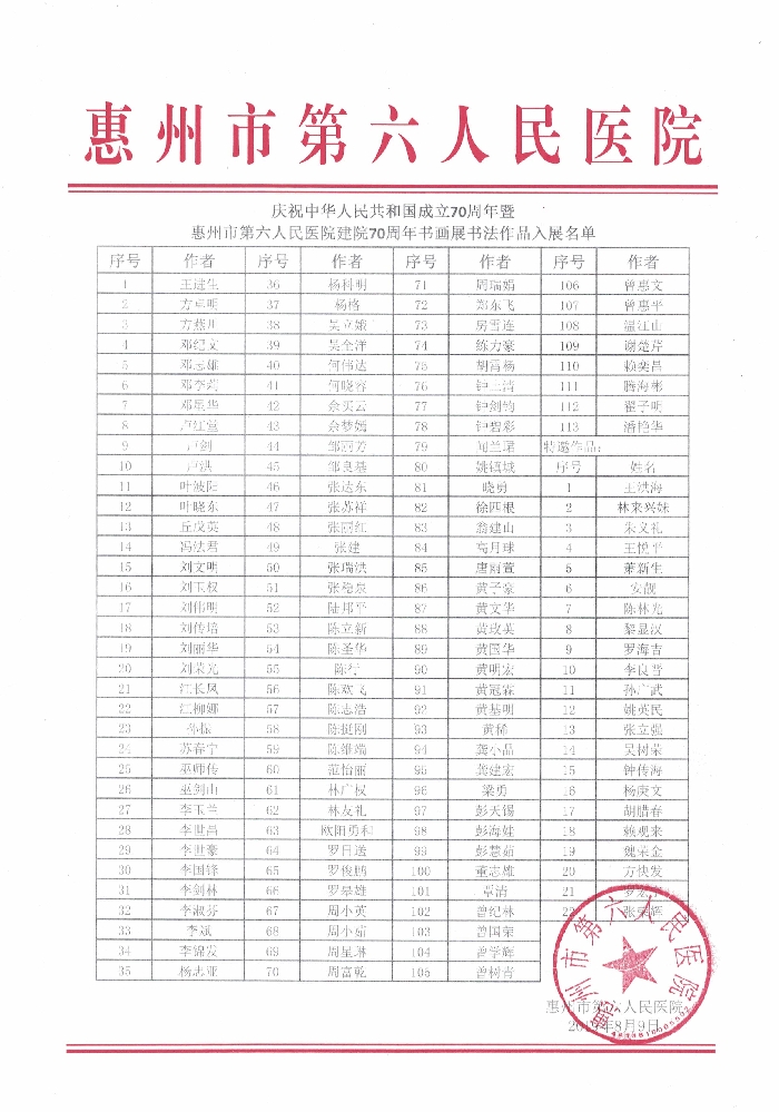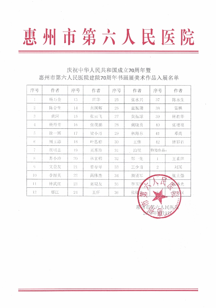 近日,慶祝中華人民共和國(guó)成(chéng)立70周年暨惠州市第六人民醫院建院70周年書畫展作品在惠州市第六人民醫院多功能(néng)廳評審結束。