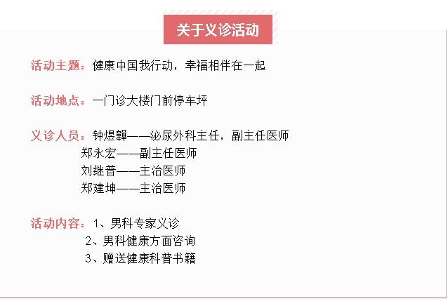 10月28日是中國(guó)男性健康日,屆時(shí)我院將(jiāng)舉辦“中國(guó)男性健康日”義診活動,歡迎各位市民朋友參加活動,一起(qǐ)了解關于如性功能(néng)障礙,早洩,前列腺炎,男性不育等男性健康的科普知識。↓↓↓