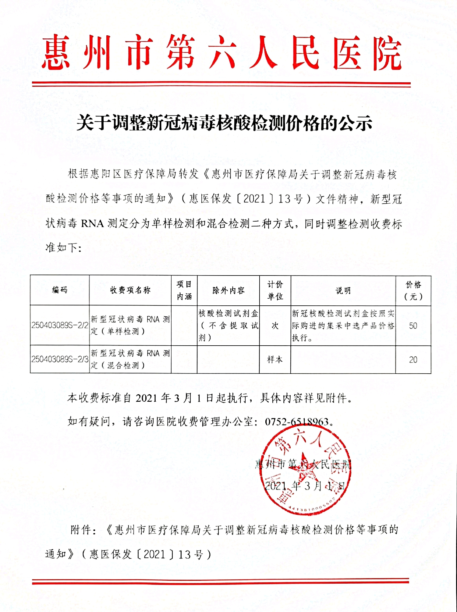 《惠州市醫療保障局關于調整新冠病毒核酸檢測價格等事(shì)項的通知》(惠醫保發(fā)〔2021〕13号)
