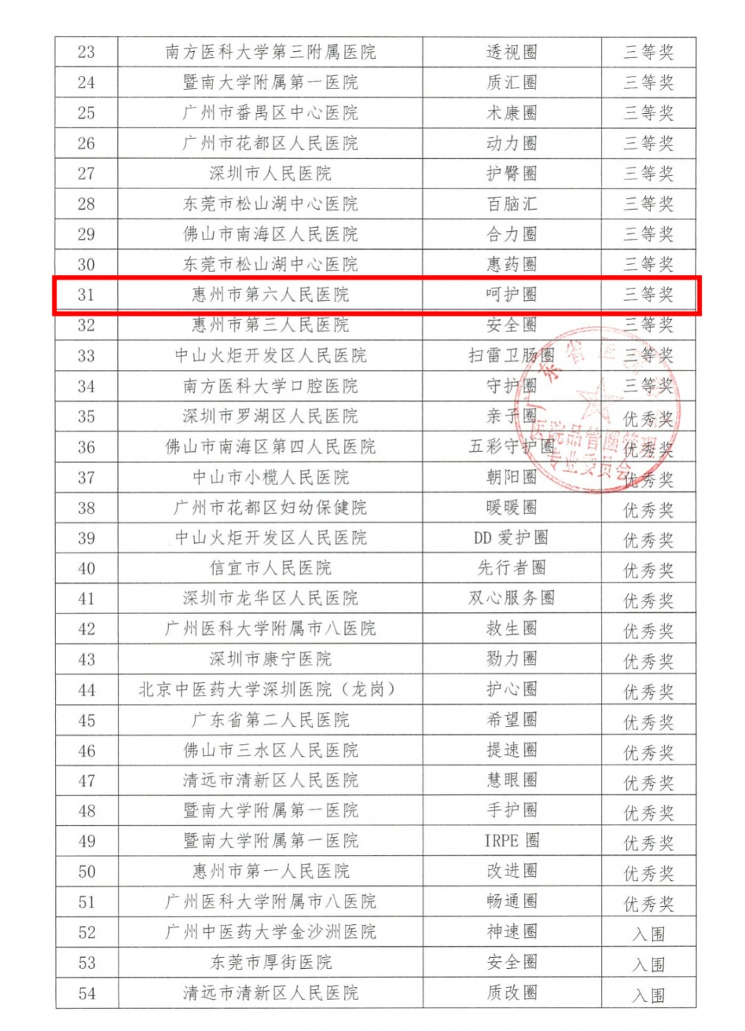 2023年10月8日-10日,廣東省第六屆醫院品管圈大賽完成(chéng)評選,惠州市第六人民醫院在全省219個參賽團隊中獲得三級醫院綜合組三等獎(産科“呵護圈”《降低陰道(dào)分娩産後(hòu)出血發(fā)生率》)、三級醫院護理組優秀獎(胃腸肝膽外科“肝膽相照圈”《提高術後(hòu)患者鎮痛有效率》)。