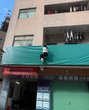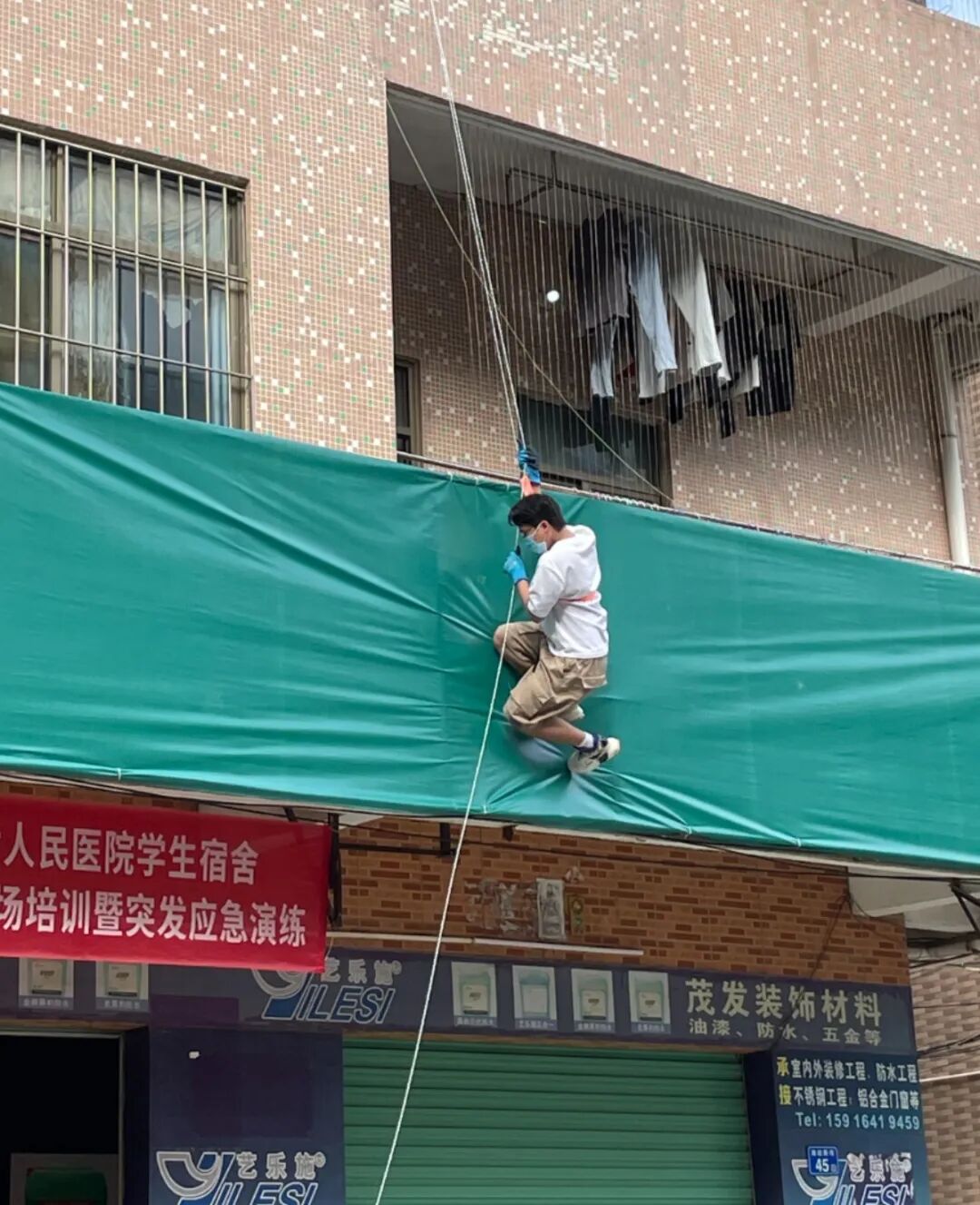 同時(shí),後(hòu)勤保障部在各樓層陽台處加裝緩降逃生繩,緩降逃生繩可快速輸送高層被(bèi)困人員緩降至地面(miàn),實習生們積極、踴躍參與體驗。緩降逃生繩的投入使用,有效提升了發(fā)生火災時(shí)實習生們的逃生率。