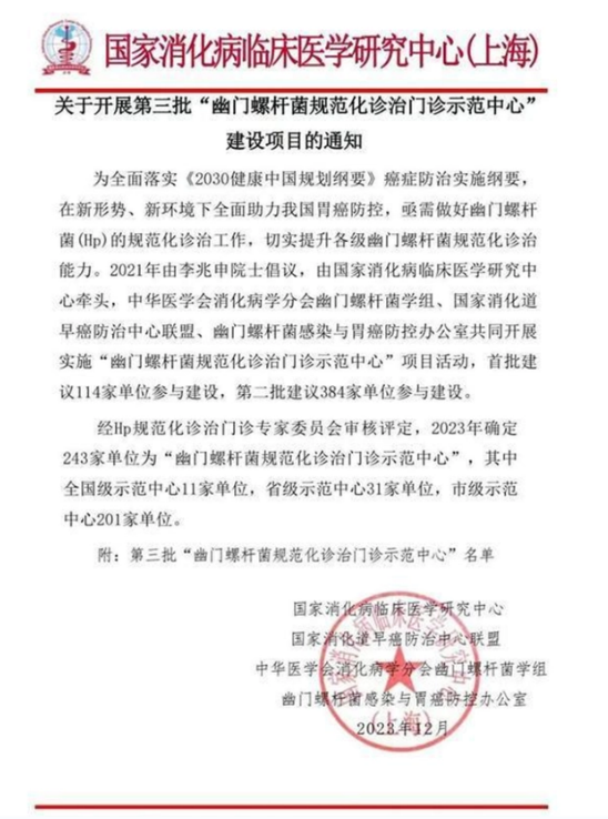 “幽門螺杆菌規範化診治門診示範中心項目”是由國(guó)家消化道(dào)臨床醫學(xué)研究中心、中華醫學(xué)會(huì)消化病學(xué)分會(huì)幽門螺杆菌學(xué)組、國(guó)家消化道(dào)早癌防治中心聯盟、幽門螺杆菌感染與胃癌防控辦公室共同發(fā)起(qǐ)并開(kāi)展實施,旨在做好(hǎo)幽門螺杆菌的規範化診治工作,切實提升各級幽門螺杆菌規範化診治能(néng)力。我院成(chéng)功獲評“幽門螺杆菌規範化診治門診市級示範中心”,這(zhè)是對(duì)我院幽門螺杆菌規範化診治優勢和專業性的肯定,同時(shí)也將(jiāng)進(jìn)一步推動本區域消化道(dào)早癌防治工作。
